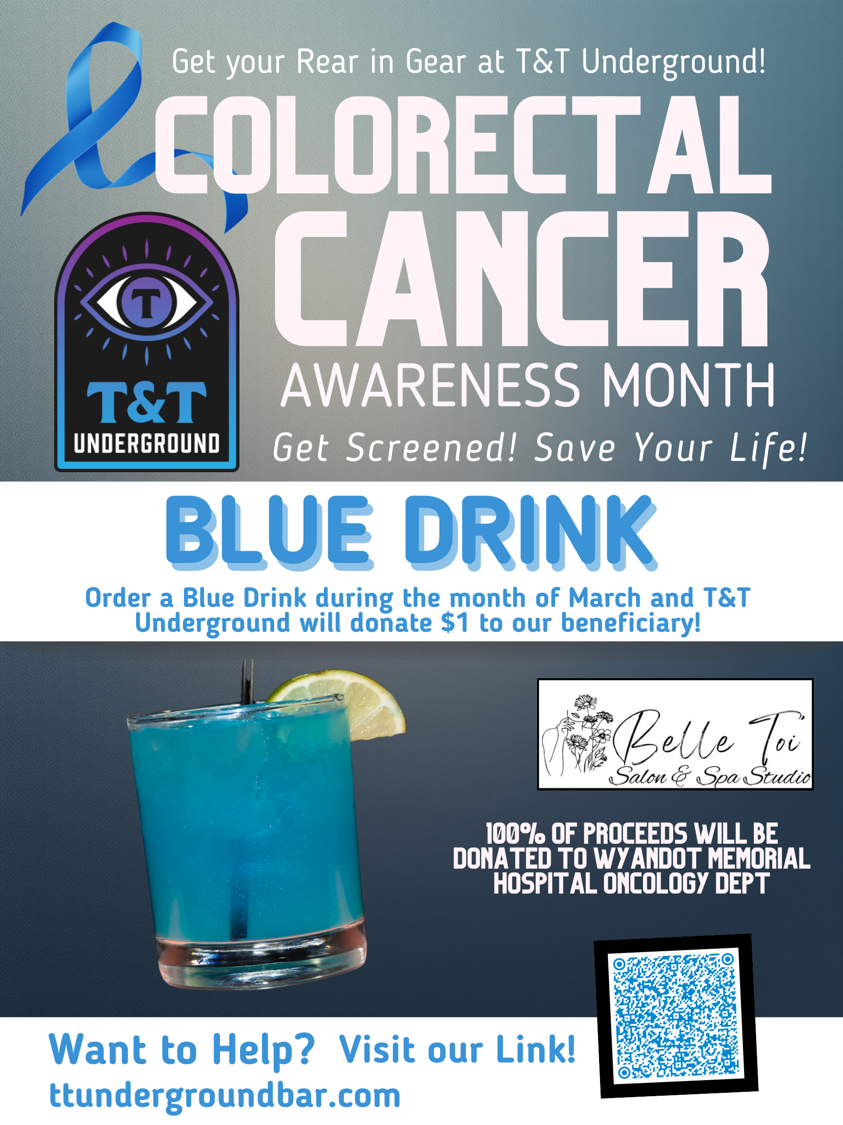 March 20th is Get your Rear in Gear night at the Underground! Ready to put your money where it matters? Come in to T&T to purchase a Blue Drink! T&T Underground will donate $1.00 for every drink purchased through the month of March. π§Ώπ