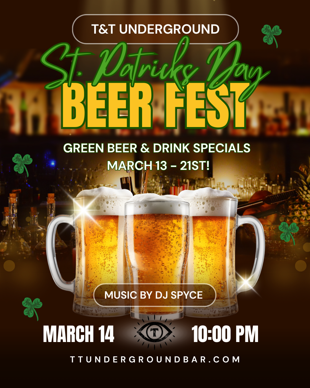 DJ SPYCE is getting down in town from 10-2AM! ππ Come out to the Underground and get a little Shaaaaaaamrocked. ππ Green Beer and Drink Specials all week long! March 13 – 21st.